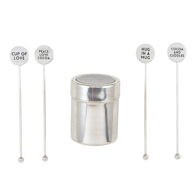This cardboard book set is perfect for anyone who loves hot cocoa! This set includes stainless steel stir sticks and a shaker.